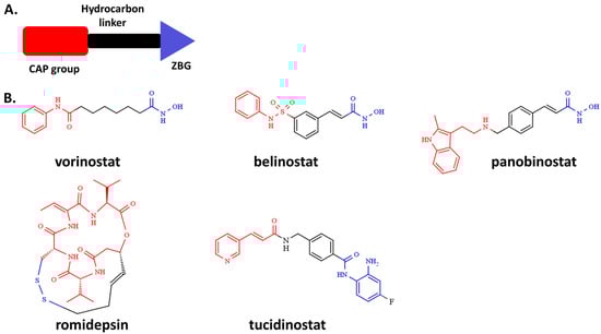 In the human proteome, there are 11 known HDACs (named HDAC1-11) that are zinc-containing metalloenzymes and 7 NAD+-dependent histone deacetylases (known as sirtuins 1–7) []. The first resolution of the crystal structure of a histone deacetylase-like protein in complex with its inhibitors [] provided three key components of the general pharmacophore required for HDAC inhibition, namely, a surface recognition group (CAP group), a hydrocarbon linker (aliphatic or aromatic linker), and the zinc binding group (ZBG), which acts as a warhead (Figure 1A) []. Thus far, many HDAC inhibitors (HDACi) have been designed and synthesized [], with five of them currently used in chemotherapy of hematological malignancies (Figure 1B). Hydroxamic acid is the most widely used ZBG, which is present in marketed drugs such as vorinostat, belinostat, and panobinostat. Others include the natural product romidepsin, which has an alternative ZBG, as it is a prodrug that possesses a disulfide bond that, upon metabolism, releases a zinc binding thiol group and the 2-aminobenzamide inhibitor, tucidinostat (Figure 1B).