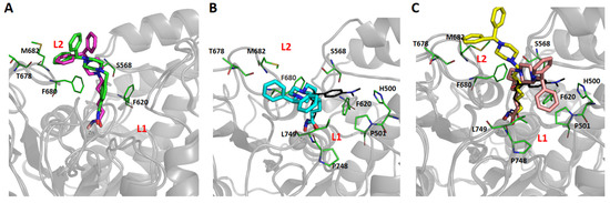 The predicted binding modes of all studied inhibitors were in alignment with available X-ray crystal structures, where the linker is sandwiched between F620 and F680 of aromatic crevice of HDAC6, and CAP groups interact with L1 and/or L2 pockets at the mouth of HDAC6 active site (Figure 3, Figures S3–S6, Supplementary Information) []. The results of the MD simulations reveal that increasing the length of aliphatic linkers from five to seven carbon atoms contributed to considerable differences in the binding modes of 6b, 7b, and 8b. In contrast, 6b retained a similar binding mode as ligand 9b, preferably interacting with the L2 pocket (Figure 3A), and 7b interacted preferentially with L1 pocket (Figure 3B). Due to the presence of the longest linker in 8b, the binding mode of this inhibitor was able to shift between L1 and L2 pockets, which is reflected as a bimodal distribution of distances between centers of masses of the CAP group and L1 or L2 pockets (Figure 3C and Figure S6). This observation is in agreement with the binding conformations observed in the X-ray crystal structure of the HDAC6–ricolinostat complex [].