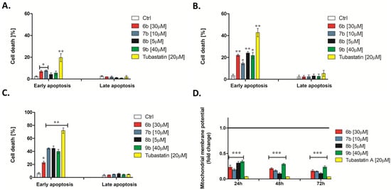 Initially, the ability of compounds to induce apoptosis of MDA-MB-231 cells was analyzed after 24, 48, and 72 h treatment at IC50 concentration by flow cytometry using Annexin V-FITC/7-AAD staining. The induction of early apoptotic cell death was time-dependent in MDA-MB-231 cells upon treatment with 6b, 7b, 8b, 9b, and tubastatin A (Figure 4A–C).