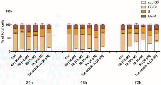 To account for possible anti-proliferative effects of synthesized HDAC inhibitors, we analyzed changes in the cell cycle distribution at IC50 concentrations in a time-dependent manner. Treatment of MDA-MB-231 cells with all compounds resulted in a time-dependent increase in MDA-MB-231 dying cell population, followed by a reduction in cells in the G0/G1 phase of the cell cycle (Figure 5). Treatment of MDA-MB-231 cells with 7b and 8b at 24 h resulted in a slight increase in the percentage of cells in the G2/M phase, while treatment with 9b increased the percentage of cells in the S phase of the cell cycle (Figure 5). Moreover, the treatment of cells with 7b, 8b, and 9b after 48 h increased percentage of cells in S phases (Figure 5). Tubastatin A induced an increase in the MDA-MB-231 dying cell population (sub-G1 phase cells around 30% at 72 h) in a time-dependent manner, followed by a reduction in the number of cells in the G0/G1 phase of the cell cycle (Figure 5).