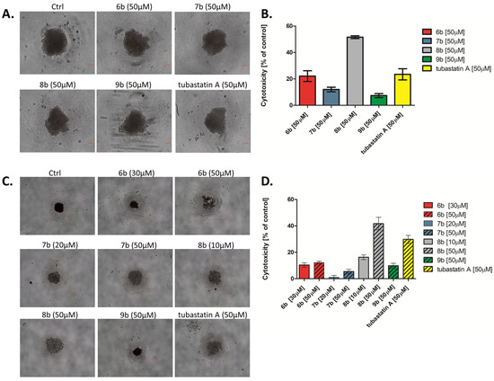 A 3D tumor sphere model of MDA-MB-231 cells was introduced to investigate the effects of synthesized compounds at the equimolar concentration (50 µM) on the viability and growth kinetics of tumor spheres after 72 h, in comparison with tubastatin A. After 4 d, formed spheres treated with 8b for 72 h revealed tenfold lower sensitivities to 8b (IC50 = 50 µM) (Figure 6B) than in 2D cell culture (Table 1). Compound 6b, as well as tubastatin A, caused a mild decrease in tumor sphere viability at 50 µM concentration, while compounds 7b and 9b did not exhibit significant cytotoxic effects in examined spheres (Figure 6B). Moreover, 8b-treated spheres decreased in size after 72 h of treatment (Figure 6A).