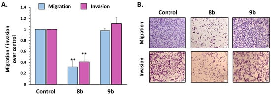 Compound 8b inhibits migration and invasion of MDA-MB-231 cells (A). MDA-MB-231 cells were subjected to bicameral migration (blue) and invasion (purple) assay. Cells were treated with 5 μM of 8b and 10 μM of 9b for 24 h. Cells in the bottom of the 8 mm pore membrane were fixed and quantified. Microphotographs show crystal-violet-stained migratory and invasive cells (B). Magnification 40×, scale bar = 50 μm. Representative results from three independent experiments are shown. Significant difference between treatments was determined by t-test: ** p < 0.01.