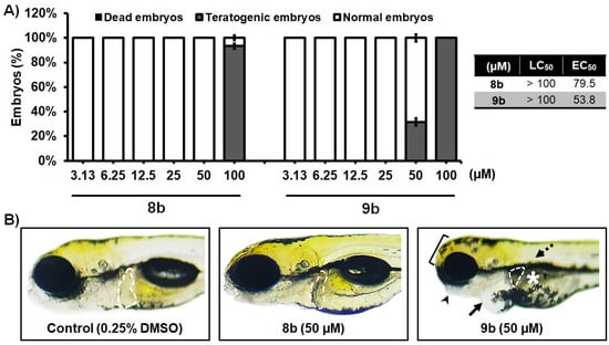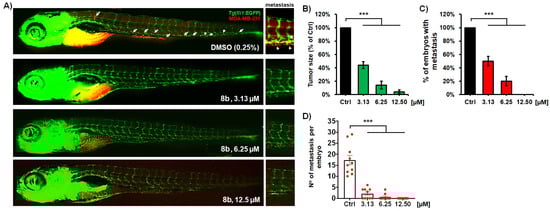 The zebrafish xenografts with human MDA-MB-231 cells were established according to the previously described procedure with slight modification []. A day before the microinjections, Tg(fli1:EGFP) embryos kept at 28 °C were manually dechorionated. At the 48 hpf stage, 5 nL of MDA-MB 231 cell suspension containing 150 labeled cells was microinjected into the yolk of anesthetized embryos by a pneumatic picopump (PV820, World Precision Instruments, Sarasota, FL, USA). The exact number of cells was confirmed by dispensing the injected volume onto a microscope slide and by visual counting. After injection, embryos were incubated, to recover, for at least for 60 min at 28 °C, dead embryos were removed, while alive embryos were transferred into 24-well plates containing 1 mL of E3 water and 10 embryos per well. The injected xenografts were treated with the three doses of 8b (3.13, 6.25, and 12.5 µM), and maintained at 31–32 °C by 120 hpf. DMSO (0.25%) was used as a negative control. The survival and development of the xenografted embryos was recorded every day until the end of experiment (3 days post injection = 3 dpi), at which point, anesthetized xenografts were processed by fluorescent microscopy. The tumor size, number of xenografts with disseminated tumor cells in the caudal region, and number of disseminated cells per embryo were determined. The tumor size was determined by the fluorescent images using ImageJ. The experiment was repeated two times using 10 embryos per concentration.