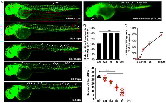 The inhibitory activity of 8b on angiogenesis was examined using embryos of the transgenic zebrafish Tg(fli1:EGFP) line with GFP-labeled endothelial cells, as previously described []. Briefly, embryos at the 6–8 hpf stage were exposed to three non-toxic concentrations and incubated at 28 °C by 48 hpf. At 48 hpf, the treated embryos were anesthetized with 0.02% tricaine, imaged under a fluorescence microscope (Olympus BX51, Applied Imaging Corp., San Jose, CA, USA), and analyzed for the development of intersegmental blood vessels (ISVs). The experiment was performed three times using ten embryos per concentration. ISV lengths were measured using ImageJ program, and expressed as mean value with standard deviation. Inhibitory effect of the applied treatment was determined in relation to the control (DMSO-treated) group, arbitrarily set to 100%.