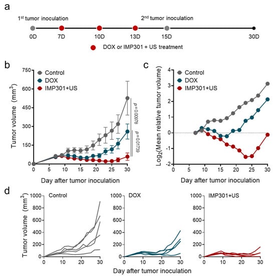 In vivo therapeutic efficacy of the combination of IMP301 and US in 4T1 tumor-bearing mice. (a) Schematic illustration of the treatment protocol; (b,c) changes in tumor size as a function of time. (d) Individual tumor growth in volume (n = 5).
