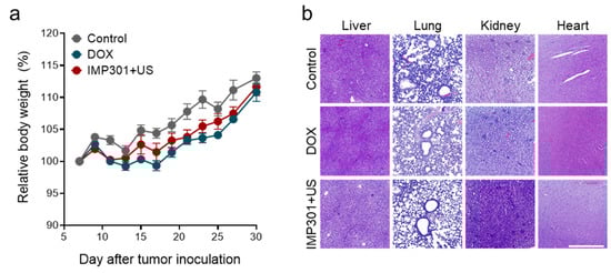 In vivo toxicity of the combination of IMP301+US. (a) Changes in body weight and (b) H&E-stained liver, lung, kidney, and heart tissues. Scale bar represents 500 µm.