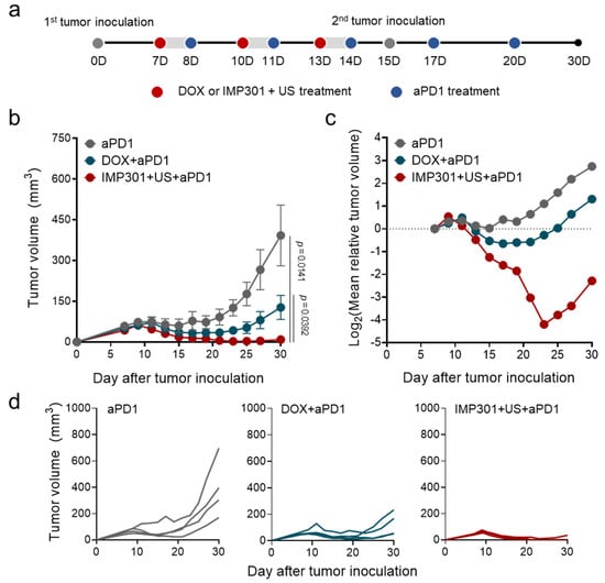 In vivo therapeutic efficacy of the combination of aPD1, IMP301, and US treatment in 4T1 tumor-bearing mice. (a) Schematic illustration of the treatment protocol; (b,c) changes in tumor size as a function of time. (d) Individual tumor growth in volume (n = 4).