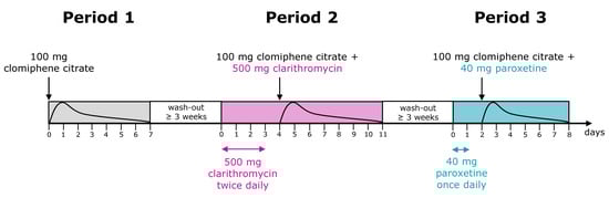 The study was conducted in 20 healthy, Caucasian, premenopausal female volunteers that were genotyped for CYP2D6 polymorphisms and subsequently assigned to predicted phenotypes according to the respective CYP2D6 activity score (AS) as depicted in Table 1 [17,18]. All subjects received 100 mg clomiphene citrate (two 50 mg tablets Ratiopharm GmbH, Ulm, Germany, with 62:38 (E)-Clom:(Z)-Clom) as a single dose after an overnight fast and without any concomitant medication. After a wash-out phase of at least three weeks, clomiphene was administered concomitantly with the strong CYP3A4 inhibitor clarithromycin [19]. Here, the participants received 500 mg clarithromycin twice daily for four days. On day 5, a single dose of clomiphene citrate was administered together with 500 mg clarithromycin. Finally, in the third period, all subjects received clomiphene citrate together with the strong CYP2D6 inhibitor paroxetine [19]. Here, 40 mg paroxetine was administered once daily for two days. On day 3, participants received a single dose of clomiphene citrate concomitantly with 40 mg paroxetine (Figure 1).
