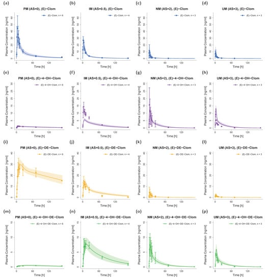 The performance of the parent–metabolite PBPK model was evaluated, applying several graphical and quantitative methods. The predicted plasma concentration–time profiles of (E)-Clom, (E)-4-OH-Clom, (E)-DE-Clom and (E)-4-OH-DE-Clom were graphically compared with their respective observed plasma profiles for all investigated CYP2D6 AS populations. Additionally, goodness-of-fit plots were used to compare predicted and observed areas under the plasma concentration–time curves from the first to the last time point of measurements (AUClast), Cmax values and plasma concentrations of all model compounds for the DGI and DD(G)I scenarios. As quantitative measures, the mean relative deviation (MRD) of predicted plasma concentrations and the geometric mean fold error (GMFE) of predicted AUClast and Cmax were calculated according to Equations (2) and (3), respectively: