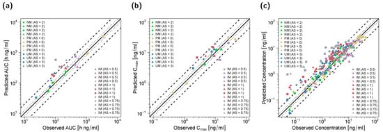 Predicted versus observed AUClast (a), Cmax (b) and plasma concentrations (c) of (E)-Clom (circles), (E)-4-OH-Clom (triangles), (E)-DE-Clom (squares) and (E)-4-OH-DE-Clom (diamonds) in PM, IM, NM and UM (DGI scenarios). The black solid lines mark the lines of identity. Black dotted lines indicate 1.25-fold; black dashed lines indicate two-fold deviation. Goodness-of-fit plots of digitized studies are depicted in Figure S8 of the supplementary document. AS, CYP2D6 activity score; DGI, drug–gene interaction; (E)-4-OH-Clom, (E)-4-hydroxyclomiphene; (E)-4-OH-DE-Clom, (E)-4-hydroxy-N-desethylclomiphene; (E)-Clom, (E)-clomiphene; (E)-DE-Clom, (E)-N-desethylclomiphene; IM, intermediate metabolizers; NM, normal metabolizers; PM, poor metabolizers; UM, ultrarapid metabolizers.