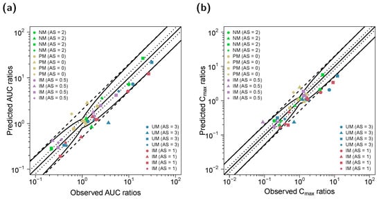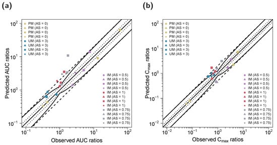 For the evaluation of DGI and DD(G)I effects, the predicted AUClast and Cmax effect ratios were calculated according to Equations (4) and (5) and compared with the corresponding observed values. Here, model performance was assessed using the prediction acceptance limits proposed by Guest et al. with 1.25-fold variability [32].