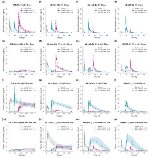 Predicted and observed plasma concentration–time profiles of (E)-Clom (a–d), (E)-4-OH-Clom (e–h), (E)-DE-Clom (i–l) and (E)-4-OH-DE-Clom (m–p) for DD(G)I scenarios in PM (first column), IM (only AS = 0.5 shown; second column), NM (third column) and UM (last column). Grey dashed lines depict the predicted geometric mean concentration–time profiles in absence of clarithromycin and paroxetine (control); turquoise solid lines represent the predicted geometric mean profiles in the presence of paroxetine; and pink solid lines represent the predicted geometric mean profiles in the presence of clarithromycin (DD(G)I). Colored ribbons show the corresponding geometric standard deviation of the population simulations (n = 1000). Mean observed data are shown as symbols with the corresponding standard deviation. Linear and semilogarithmic predicted and observed plasma concentration–time profiles of all AS are shown in Section S4.2 of the supplementary document. For better visibility, DD(G)I scenarios were plotted with a time offset with t = 0 at the first dose of the perpetrator drug. AS, CYP2D6 activity score; Clarit., Clarithromycin; DD(G)I, drug–drug and drug–drug–gene interactions; (E)-4-OH-Clom, (E)-4-hydroxyclomiphene; (E)-4-OH-DE-Clom, (E)-4-hydroxy-N-desethylclomiphene; (E)-Clom, (E)-clomiphene; (E)-DE-Clom, (E)-N-desethylclomiphene; IM, intermediate metabolizers; n, number of subjects; NM, normal metabolizers; Parox., Paroxetine; PM, poor metabolizers; UM, ultrarapid metabolizers.