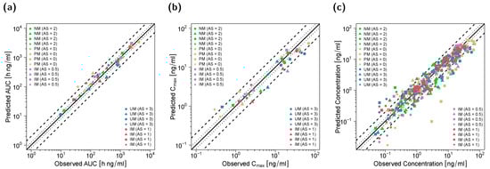 Goodness-of-fit plots for all modeled compounds showing predicted compared with observed plasma concentrations, AUClast and Cmax values in the DGI study setting are depicted in Figure 4. Here, 90% of Cmax, 80% of AUClast and 78% of the predicted concentrations were within the two-fold acceptance criterion. GMFEs for the predicted Cmax and AUClast values were 1.41 and 1.43, respectively, and the overall MRD value for predicted plasma concentrations was 1.95.