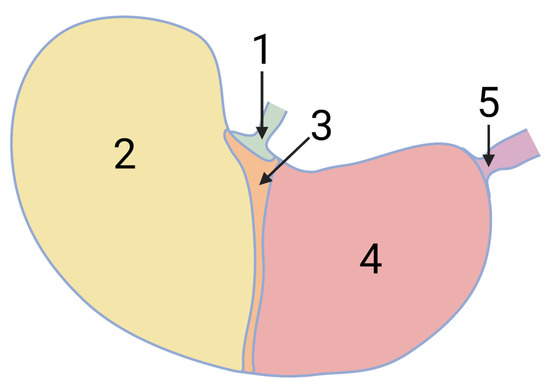 Schematic illustration of the rat stomach’s anatomy (1—cardia; 2—nonglandular stomach; 3—limiting ridge; 4—glandular stomach; 5—pylorus).