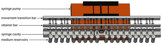 For medium uptake, the syringe plunger [11] has to be drawn backwards in the syringe cylinder. Therefore, electro motor of the syringe pump transmits a backward movement via a threaded spindle [4] to the complex of the movement transition bar [1] and retainer bar [9], that both have a fixed distance to each other and induce the movements of the syringe plunger. As the plunger endcaps [7] are adjacent to the retainer bar, the plungers have to directly follow the backward movement and accordingly draw up medium from the reservoirs into the cavities of the syringes.