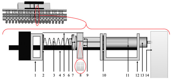 Schematic top view on the in vitro model (top). Cross section of the in vitro model with one unit displayed (below). (1—movement transmission bar; 2—disk; 3—spring; 4—spindle; 5—scale; 6—connector; 7—plunger endcaps; 8—recesses for syringe plungers; 9—retainer bar; 10—holder bars; 11—syringe plunger; 12—U-rail; 13—cavity of the syringe cylinder; 14—media reservoir).