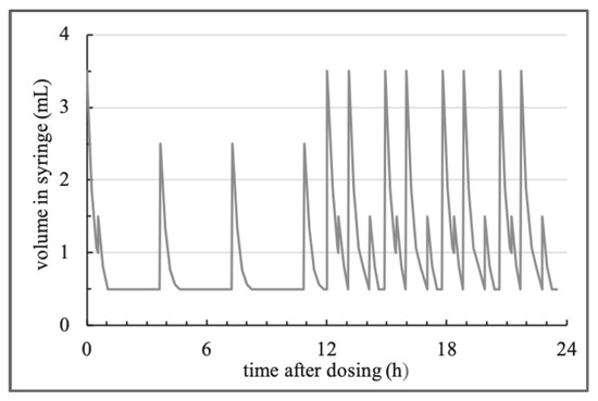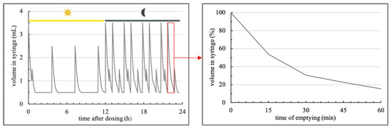 Volume changes in the cavities of the syringes where suspensions were once daily administered to, having been generated by movement of the plunger in the syringe cylinder, so that medium was drawn up and emptied together with non-agglomerated SD-ASD to the reservoirs directly attached to the syringes. To repeatably execute volume changes, we programmed a 23.5 h volume pattern using SyringePumpProV1 (Version 1.6.4.7). The frequency and dimension of motions and rests in this pattern shown in Figure 4 are freely chosen, the total amount of medium uptake of 37.5 mL, its distribution between the simulated inactive photophase (first twelve hours) and the active scotophase (last twelve hours) as well as uptake and emptying rates were transferred from physiological conditions.