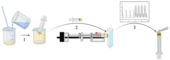 Graphical illustration of dosing procedure 1—transferring suspensions to syringe; 2—placing syringe in the in vitro model; 3—repeating daily dosing procedure (steps 1 and 2) including completion of the volume pattern until agglomerate formation is completed and agglomerates can be extracted by cutting the syringe cylinder with a scalpel.