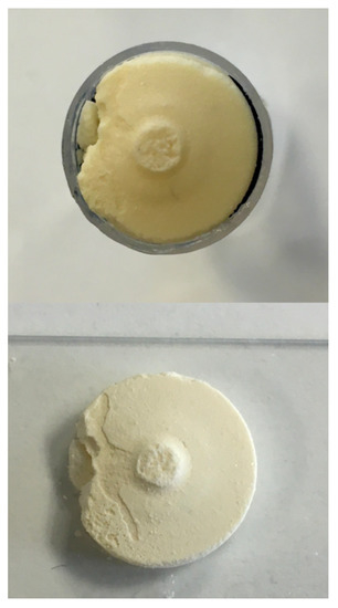 At the end of the pump cycle in which spring compression of at least 2 mm was observed, generated agglomerates were removed from the syringe. Therefore, syringe cylinders were cut open circumferentially with a scalpel as indicated in Figure 5, step 3. Agglomerates were placed on microscope glass slides and dried at 30 °C in a drying oven (Heraeus T20-Kendro, Langenfeld, Germany) until the 24 h loss-on-drying was lower than 1% (Figure 6 (below)).