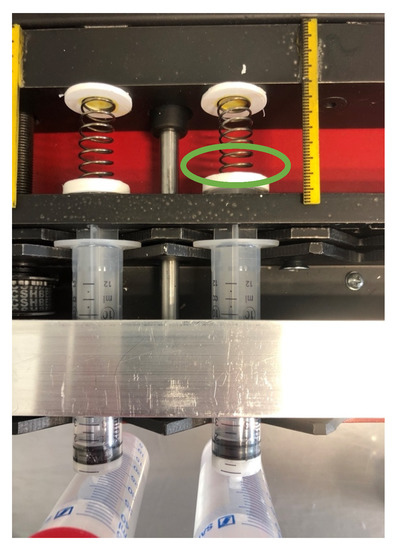 Top view on two units in the in vitro model—completion of agglomerate formation in the right syringes is indicated by the compression of the spring (indicated by green cycle).