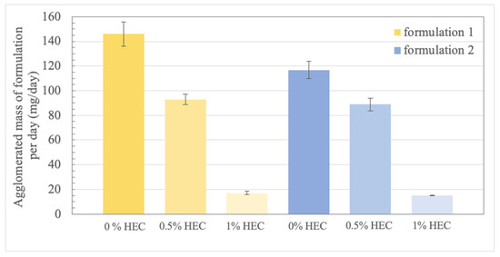 In vitro agglomerated masses per day of formulation 1 (yellow) and formulation 2 (blue) from suspensions without (n = 9), with 0.5% and 1% (w/w) hydroxyethyl cellulose (HEC) added to the vehicle as viscosity-enhancer (both n = 3).