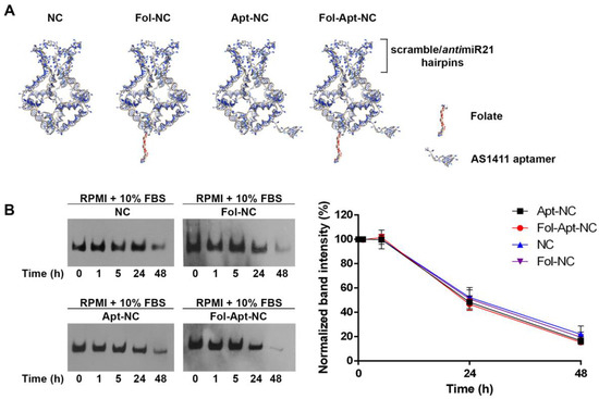 (A) Schematic representation of octahedral nanocages (NC), folate-functionalized nanocages (Fol-NC), AS1411-linked nanocages (Apt-NC), and both folate and AS1411 functionalized nanocages (Fol-Apt-NC), harboring the scramble or anti-miR21 hairpins. (B) DNA blot analysis. Biotinylated nanocages are detected using Streptavidin–HRP. 30 ng of nanocages before incubation with serum proteins (time 0) are shown in each panel. The densitometric analysis (shown in the right panel) was performed using ImageJ software. The relative intensity of each band was normalized to the intensity of the band corresponding to each time 0 and reported in the graph. The graph shows average ± SEM of three different experiments.