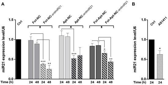 It is interesting to note that the most striking effect is observed with the folate functionalized nanocages, despite the fact that free AS1411 aptamer, being a nucleolin inhibitor, downregulates several miRNAs, including miR-21, in cancer cells [22]. Accordingly, miR-21 expression in MDA-MB-231 cells treated with 10 µM free AS1411 is reduced by 37.5% compared to non-treated control cells (Figure 2B). In line, Fol-Apt-NC, i.e., nanocages without the antimiR21 sequestering units, have an effect on the level of miR-21, indicating that AS1411 displays its antimiR-21 activity in folate-functionalized nanocages. The anti-miR21 effect is not observed in cells incubated with Apt-NC, indicating that the miR-21 reduction due to the aptamer functionalization on the cage is observable only in the presence of folate.