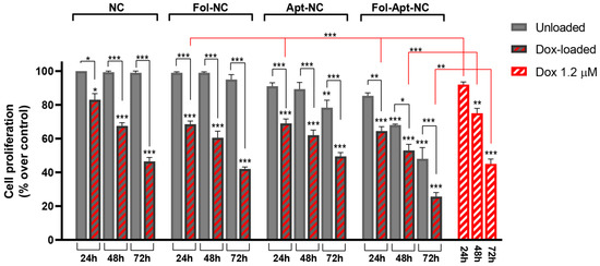 Cytotoxic effect of Dox-loaded or not-loaded NC, Fol-NC, Apt-N,C and Fol-Apt-NC and of free Dox in MDA-MC-231 cells. Cell proliferation of cells treated with NC, Fol-NC, Apt-NC, and Fol-Apt-NC not loaded (light gray) or loaded with Dox (gray and red striped) and free Doxorubicin (red and white striped) at different times, as indicated, was evaluated with MTS assay. The data represent mean ± S.E.M. of three separate experiments. The values are the mean of six replicates, normalized on cell proliferation of untreated cells. Statistical analysis was performed to compare at each time point (i) all groups vs. untreated cells, (ii) Dox-loaded-NC groups vs. unloaded-NC treated cells, and (iii) free Dox treated vs. Dox-loaded-NC treated cells. Statistical significance: * p < 0.05, ** p < 0.01, and *** p < 0.01 (ANOVA test).
