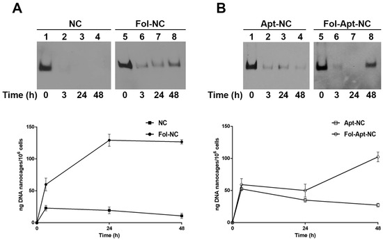 To verify this hypothesis, we compared the intracellular stability in MDA-MB-231 cells of non-functionalized nanocages (NC), folate-functionalized (Fol-NC), AS1411-linked nanocages (Apt-NC), and AS1411 and folate doubly functionalized nanocages (Fol-Apt-NC). In detail, cells were treated with 8 μg/mL (45 nM) of biotinylated nanocages and, at different time points, nanocages were purified from cell extracts and analyzed with a DNA blot using streptavidin–HRP (Figure 4). It is important to remark that we did not observe any difference in the internalization mechanism using a range of concentrations between 1.5 and 10 μg/mL nanostructures. Lanes 1 and 5 of panel A and 1 and 5 of panel B in Figure 4 show the electrophoretic mobility of the input band of NC and Fol-NC (15 ng), respectively, prior to the incubation with cells (time 0). In MDA-MB-231 cells, purified DNA nanocages run as a single band with mobility comparable to the input, indicating that they are intact inside cells. It is worth noting that, in MDA-MB-231 cells, bands corresponding to pristine DNA nanocages (NC) are only barely detectable, indicating a very low amount of NC inside cells (Figure 4, panel A, lanes 1-4). On the contrary, after 3 h incubation with cells, a band corresponding to intact Fol-NC (Figure 4, panel A, lanes 6), or Apt-NC (panel B, lanes 2) and Fol-Apt-NC (panel B, lane 6), is detectable. A band with similar intensity is visible at 24 h of incubation (Figure 4, panel A, lane 7; panel B, lanes 3 and 7). At 48 h incubation, only cells treated with Fol-NC or Fol-Apt-NC (Figure 4, panels A and B, lanes 8) show an intense band indicating a marked amount of intact nanocages inside MDA-MB-231 cells. In the case of the incubation of cells with Apt-NC at 48 h, the band is almost undetectable, confirming our previous observation that AS1411 functionalized nanocages, when uptaken by the nucleolin-mediated pathway, are degraded and do not accumulate inside cells [16].
