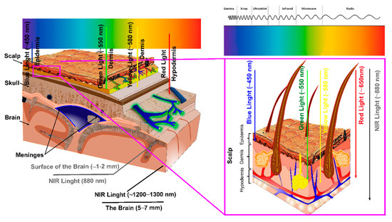 - Salehpour, F.; Cassano, P.; Rouhi, N.; Hamblin, M.R.; De Taboada, L.; Farajdokht, F.; Mahmoudi, J. Penetration profiles of visible and near-infrared lasers and light-emitting diode light through the head tissues in animal and human species: A review of literature. Photobiomodul. Photomed. Laser Surg. 2019, 37, 581–595. [Google Scholar] [CrossRef] [PubMed]