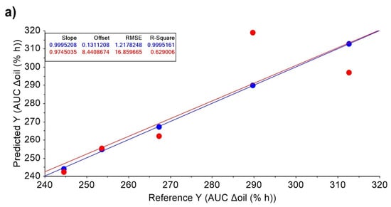 MLR models and fitting parameters for calibration and validation data for: (a) AuC Δoil and (b) Xmax ΔHydration. Blue and red circles represent calibration and validation data, respectively for MRL models. RMSE: Root Mean Square Error.