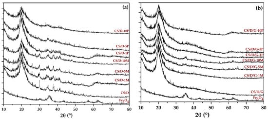 Diffractograms acquired for the CS/D (a) and CS/D/G (b) hydrogels.