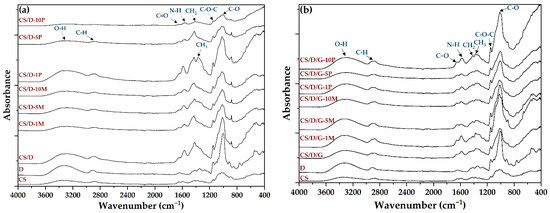 FT-IR spectra of the CS/D (a) and CS/D/G (b) hydrogels.