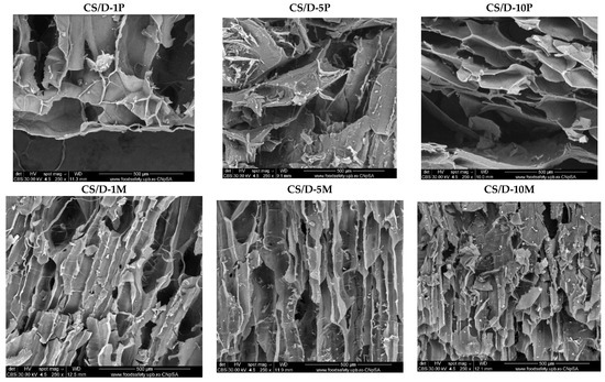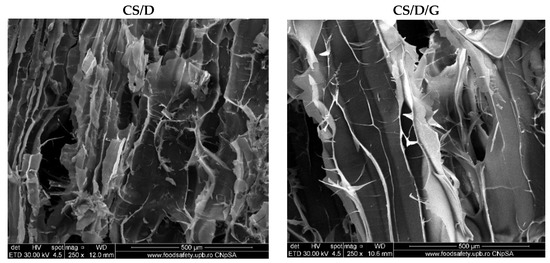 As can be seen, the control hydrogels (Figure 3) exhibit an interconnected porous structure, which is essential for the processes of cell migration and transport of biomolecules required for skin regeneration. Moreover, the pores of both hydrogels exhibit a lamellar structure with ranging dimensions. Specifically, the pore diameter of the CS/D hydrogels varies between 20 and 150 nm, while for the CS/D/G, the pore size is ~150 nm. Therefore, it can be concluded that the presence of glycerol within the composite hydrogels leads to the formation of larger, but more uniform internal pores.