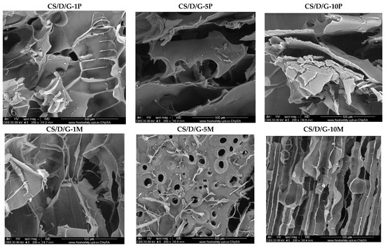 Subsequently, the micrographs for the CS/D/G hydrogels containing readily added or in situ formed magnetite are presented in Figure 5. Similar to the CS/D hydrogels, the presence of agglomerates increases with the concentration of magnetite nanoparticles or iron precursors added within the hydrogels. Anew, the 10% iron precursor concentration leads to the internalization of the iron ions within the pore walls. However, the presence of glycerol leads to the formation of pores with irregular shapes. Furthermore, the CS/D/G-5P and CS/D/G-10P hydrogels do not exhibit a porous structure.