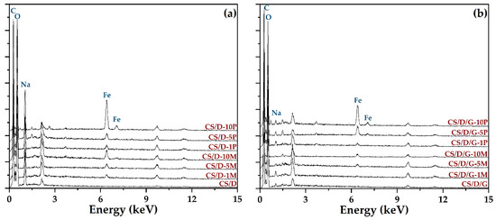 EDX spectra of the CS/D (a) and CS/D/G (b) hydrogels.