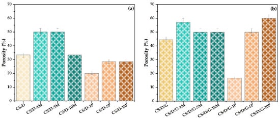 Porosity values for the CS/D (a) and CS/D/G hydrogels (b).