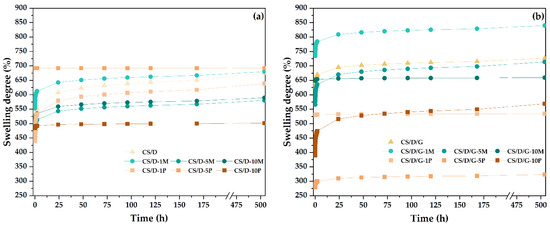 The evolution of swelling degrees of the CS/D (a) and CS/D/G hydrogels (b).