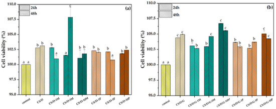Cell viability for the CS/D (a) and CS/D/G (b) hydrogels (p value < 0.03; different letters indicate levels of significance between each sample).