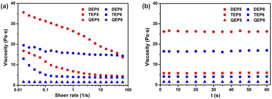 Rheological behaviors of the six liquid pillar[n]arene derivatives. Flow curves show (a) viscosity vs. shear rate over an extended range from 0.01 to 100 s−1 and (b) viscosity vs. time at a shear rate of 1 s−1.