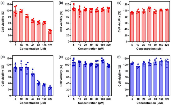 Cell viability of HaCaT cells. After treatment with various concentrations of (a) DEP5 (b) TEP5 (c) QEP5 (d) DEP6 (e) TEP6 and (f) QEP6 for 48 h, the cell viability was determined using a CCK-8 assay (n = 5, mean ± SD).