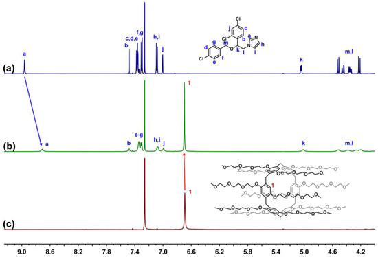 Host–guest complexation studies. 1H-NMR spectrum (600 MHz, CDCl3) of (a) ECN (5 mM) (b) ECN (5 mM) + TEP6 (5 mM) and (c) TEP6 (5 mM).