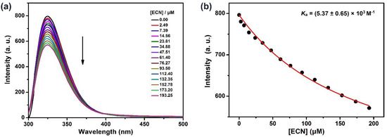 Having satisfied the most crucial parameters by 1H-NMR spectroscopy, we sought to evaluate the host–guest complexation between TEP6 and ECN quantitatively using fluorescence titration experiments. As shown in Figure 4a, along with the increasing concentration of ECN, the fluorescence intensity at 325 nm decreased gradually, which was ascribed to photo-induced electron transfer. According to a standard curve fitting protocol, the association constant (Ka) for ECN with TEP6 was calculated as 5.37 ± 0.65 × 103 M−1 (Figure 4b). In addition, the geometry optimization of ECN/TEP6 was performed using a MM2-minimized molecular model (Figure S21). The results verified the formation of a 1:1 complexation between ECN and TEP6.