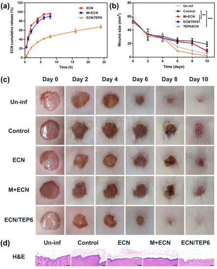 The method for the establishment of the wound healing model used in this study was presented in a previous publication [48]. In brief, Kunming mice were anesthetized with isoflurane. Then, hairs of dorsal skin were shaven and an 8 mm diameter skin wound was created. Twelve mice were randomly divided into four groups (n = 3): control, ECN, M + ECN and ECN/TEP6. Subsequently, each wound was filled with a suspension of S. aureus (ATCC 25923) (Fuxiang, Shanghai, China) at a concentration of 1 × 106 CFU. The uninfected group was not infected with S. aureus. After one day, the mice in the different groups were, respectively administrated with ECN (6.36 μmol, 5.65 mg/ cm2), M + ECN (a 1:6 mixture of ECN and M; ECN: 6.36 μmol, 5.65 mg/ cm2; M: 38.16 μmol, 28.22 mg/cm2), ECN/TEP6 (a 1:1 mixture of ECN and TEP6; ECN: 6.36 μmol, 5.65 mg/ cm2; TEP6: 6.36 μmol, 31.59 mg/cm2) and 30% DMSO. The mice were treated through topical rubbing onto the affected area every two days. The process of wound healing was regularly observed (0, 2, 4, 6, 8, and 10 days) and the wound area was recorded. In addition, on the 10th day, the skin tissue was fixed using formalin 10% v/v, and then incorporated into paraffin. Blocks of 4 μm thickness were obtained and stained with H&E.