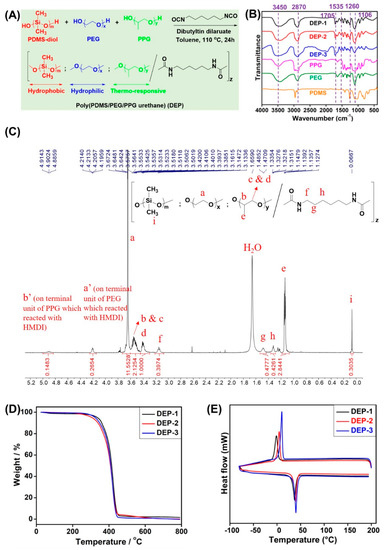 (A) The synthetic route of poly(PDMS/PEG/PPG urethane)s. (B) Normalized FT-IR spectra of starting materials PDMS-diol, PEG, PPG and synthesized copolymers DEP-n. (C) Typical 1H NMR spectrum of poly(PDMS/PEG/PPG urethane) (DEP-2) in room environment with CDCl3 as the solvent. (D) TGA and (E) DSC curves of DEP-n copolymers.