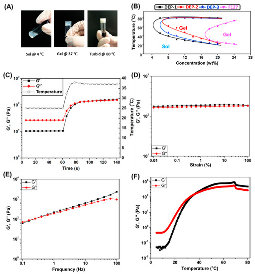 (A) Photo illustration of sol-gel transition of copolymer DEP-2 at concentration of 15% (w/v); (B) Phase diagrams of copolymers DEP-n and F127. Rheological characteristics of DEP-2 on the basis of thermal gels (15% (w/v)). (C) Sweep diagram of oscillation time, i.e., oscillation time sweep at 25 °C for 60 s, then a rapid warming rate from 25 to 37 °C within 20 s and another 60-s oscillation time sweep at 37 °C to obtain the diagram. Oscillation (D) strain and (E) sweep diagram of frequency. (F) Ramp diagram of temperature.