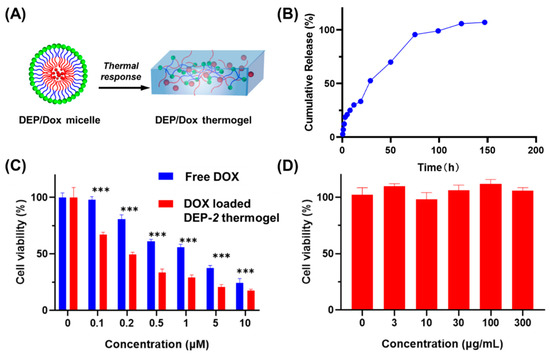 (A) Diagram of temperature-controlled conversion from polymer solution to hydrogel. (B) In vitro drug cumulative release of DOX from the DOX loaded DEP-2 based thermogel at 37 °C. (C) Survival rate of cells processed using free DOX and DEP-2 based thermal gels loaded with DOX. *** moreover, the thermal gels inhibited the proliferation of HepG2 cells remarkably more than free DOX. (D) Viability of cells treated by DEP-2.