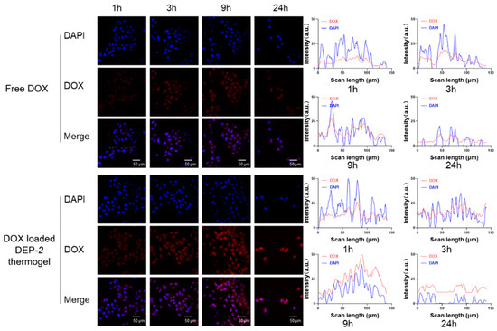 Next, to verify that the DEP-2 copolymer could serve as a good drug delivery platform, the drug delivery ability and cellular uptake of DEP-2@DOX copolymer micelles in HepG2 tumor cell lines were evaluated (Figure 4). DEP-2@DOX copolymer was more likely to enter HepG2 than free DOX. In detail, the DEP-2@DOX thermosensitive copolymer micelles group showed a favorable accumulation of red fluorescence signal of DOX after 3 h; it was indicated that the presence of DEP-2 thermosensitive copolymer conferred intracellular drug delivery of DEP-2@DOX copolymer micelles. We speculate that PDMS-mediated drug retardation and PPG thermosensitive-mediated drug retention have a synergistic effect on this drug carrier. It should be noted that the fluorescence aggregation in the DEP-2@DOX group was significant after 9 h, which adequately confirmed the drug delivery ability and cellular uptake of the DEP-2-containing copolymer micelles. This result indicated that the thermo-sensitive polymeric micelles containing DEP-2 could be taken up by HepG2, providing a possibility for the treatment of hepatocellular carcinoma.