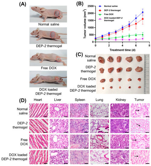 The in vivo therapeutic effect of DOX loaded DEP-2 thermogel in nude mice liver cancer model. (A) Images of subcutaneous tumor dimensions in each therapy group (normal saline, DEP-2 thermogel, free DOX and DOX loaded DEP-2 thermogel treatment groups). (B) Tumor volume development curves (n = 5). (C) Tumor images of each group after excision from mice. (D) Histological examinations using HE staining (40×) was performed on anatomical tumors and organs such as heart, liver, spleen, lung and kidney on mice processed in normal saline, DEP-2 thermogel, free DOX and DOX loaded DEP-2 thermogel.