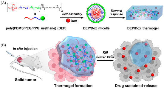 Improves the antitumor effect of DOX by forming hydrogels in situ at the tumor site through thermo responsive behavior of PDMS based polyurethanes for sustained drug release. (A) The molecular structure of copolymer DEP and the preparation of its thermal gel. (B) The slow release of drug from the thermal gel after in situ injection to achieve effective anti-tumor action.